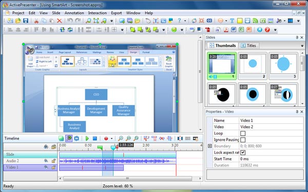ActivePresenter可用於製作多樣化的教材、錄製數位講義、說明文件,而除了電腦螢幕錄影,還能加與麥克風音訊,並搭配全功能編輯器來處理影音內容,例如裁切、剪輯、加速慢速,或是加入註解、圖片、放大特效、隱藏式字幕,調整外觀呈現方式等等。
