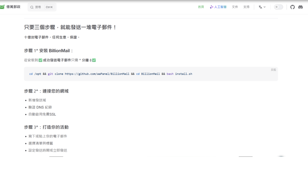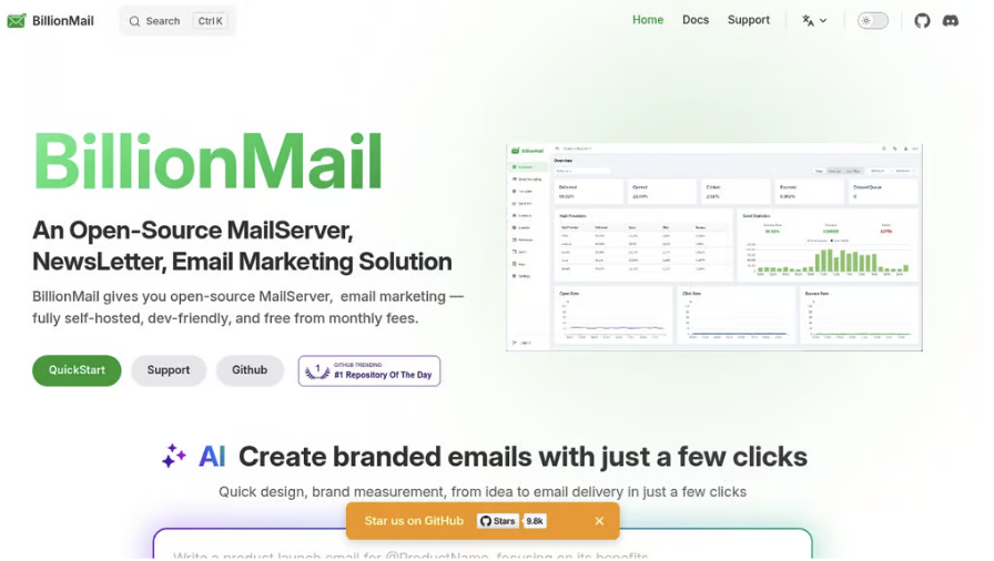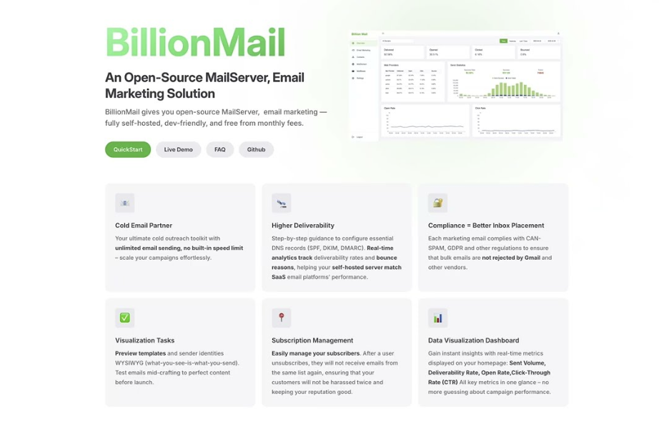 BillionMail 是一個未來的開源郵件伺服器,電子郵件行銷平台,旨在幫助企業和個人輕鬆管理他們的電子郵件行銷活動。無論您是發送電子報、促銷郵件,還是交易性訊息,這個工具都能讓您完全掌控電子郵件行銷的成效。