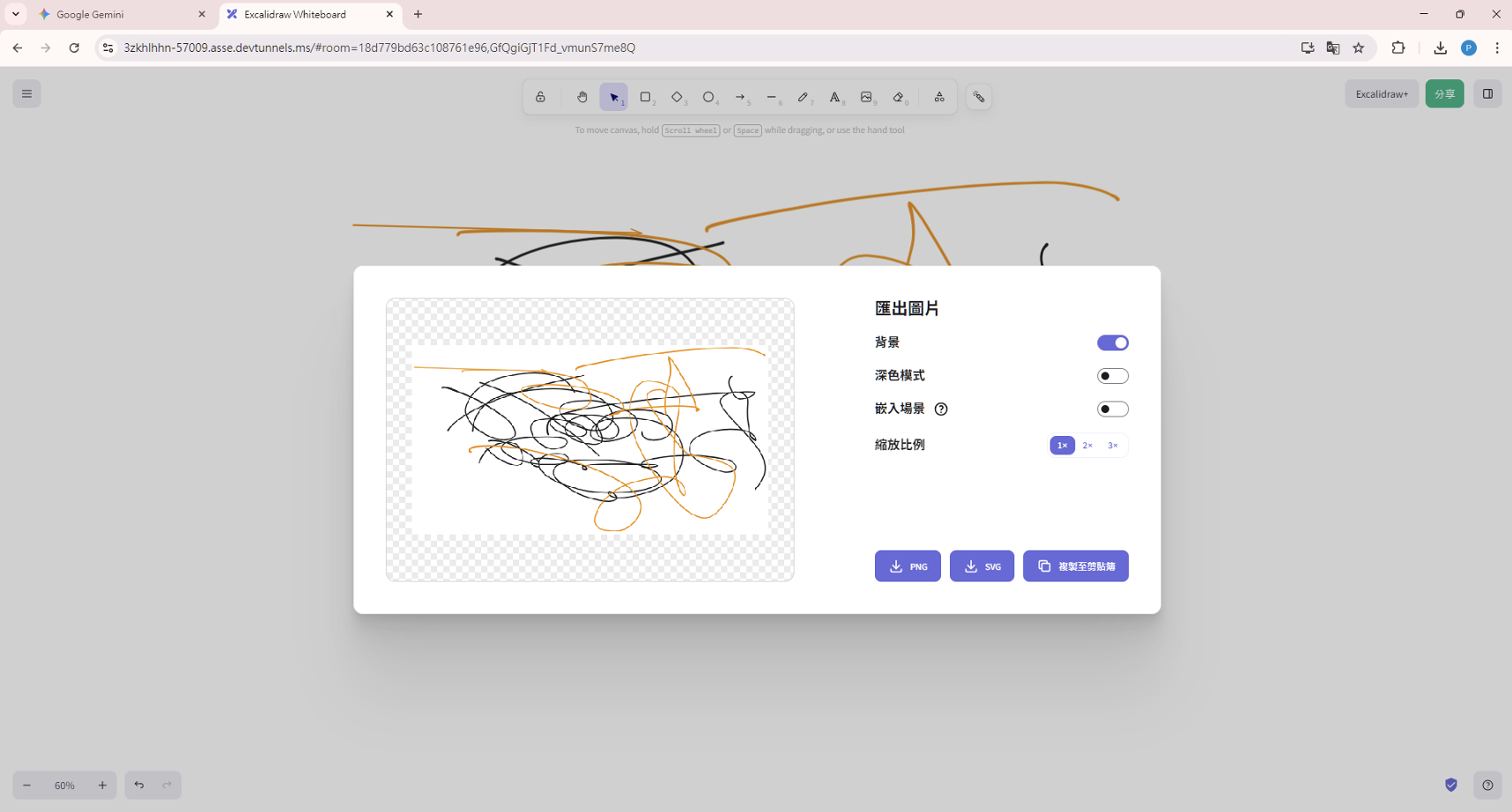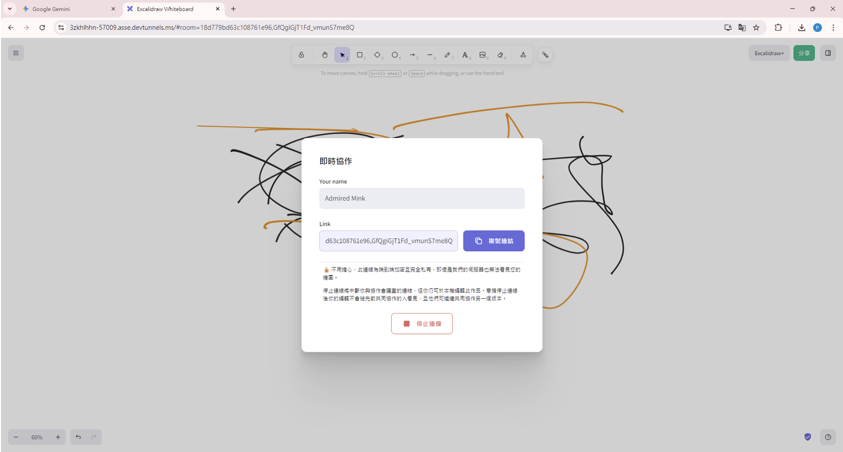 即時協作: 點擊「Live collaboration」即可生成連結,邀請多人同時在同一個畫布上編輯,並支援端到端加密(E2EE)。