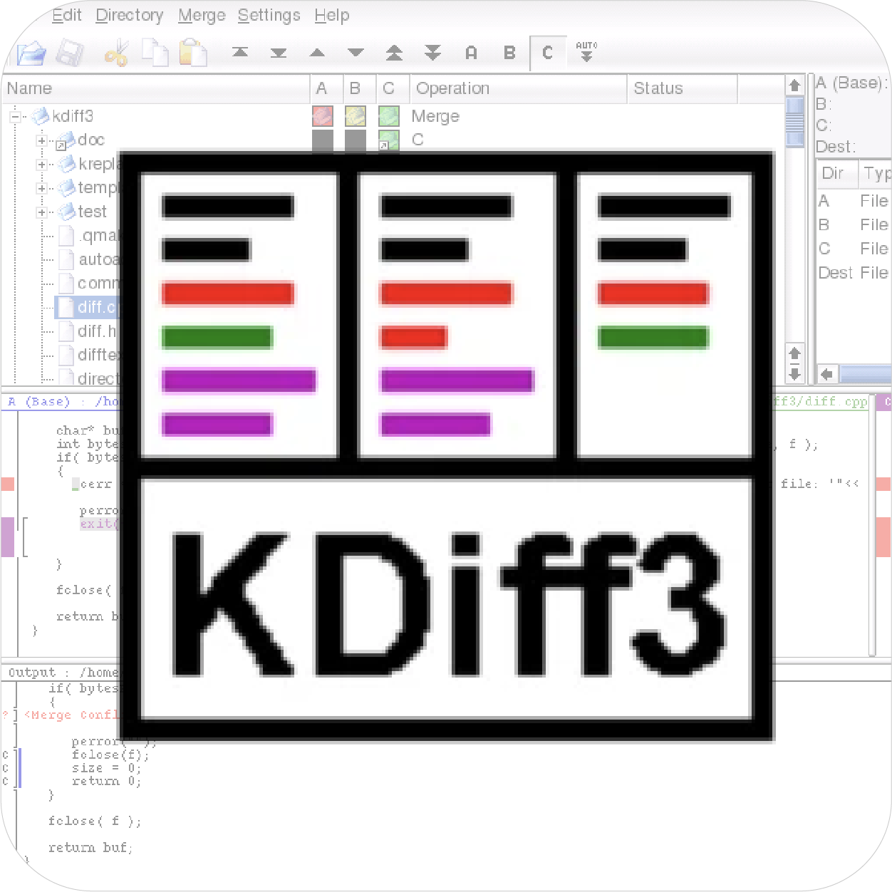 KDiff3 的核心優勢在於其強大的**三向比較(3-way comparison)**能力。與多數僅支援雙向比對的工具不同,它能同時對比原始基準檔案(Base)與兩個不同的修訂版本(Theirs / Yours),並以清晰的顏色標示(如藍色、綠色、洋紅色)區分來源。這種機制讓開發者能迅速釐清多方修改的演進過程,是處理複雜 Git 分支合併衝突時的首選方案。
