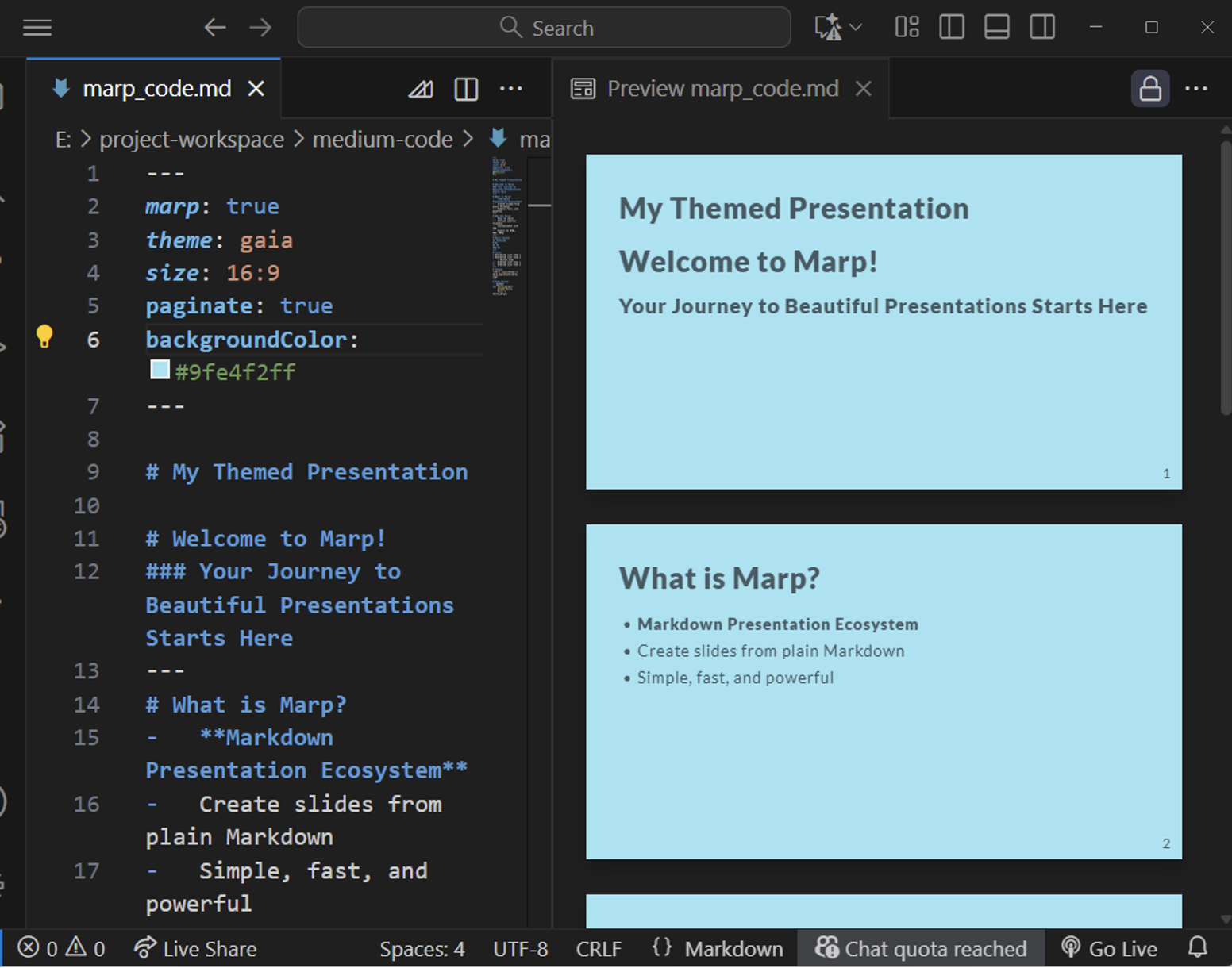 Marp 是一個開源的生態系統,允許使用者利用 Markdown 的簡潔語法來快速創建美觀的演示文稿。使用者可以在 Visual Studio Code 編輯器中透過擴展或使用命令列工具 (CLI) 來即時預覽和匯出投影片,實現內容和呈現的有效分離,大幅提升製作效率。