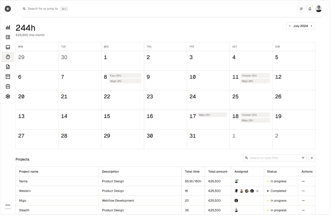- 時間追蹤:透過先進的專案時間追蹤提升生產力,促進團隊無縫協作並提供深入的專案概覽。