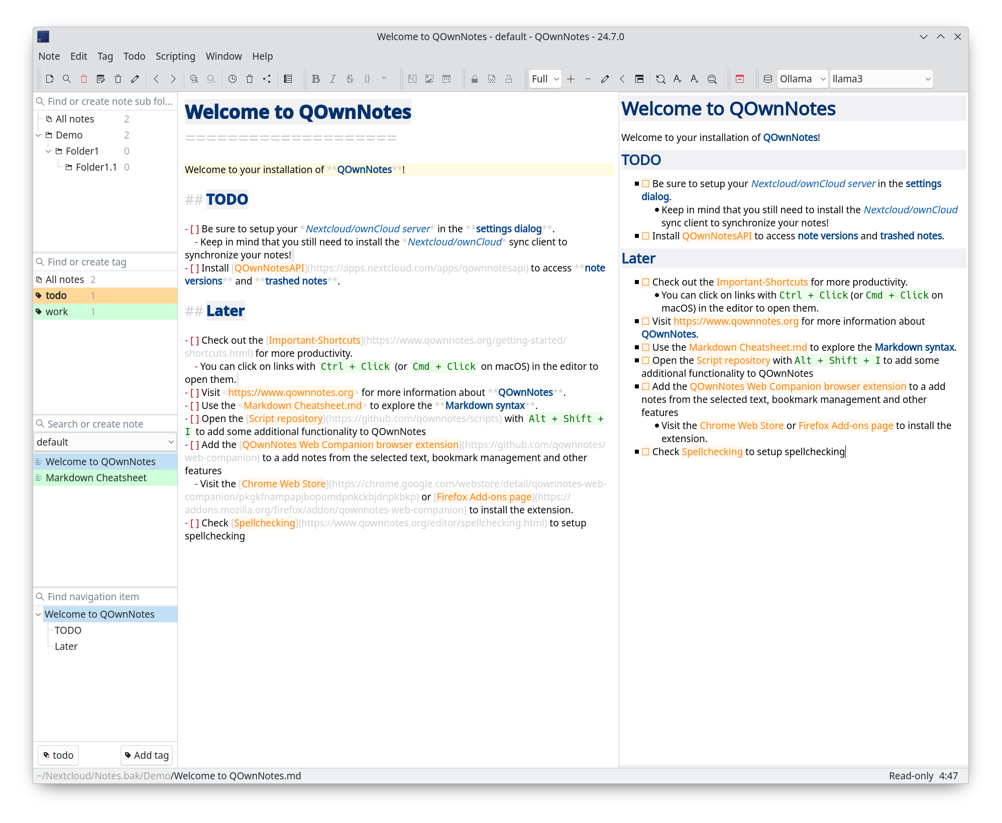QOwnNotes 是一款專為 Markdown 愛好者設計的開源編輯器。它不將筆記存放在資料庫,而是直接以 .md 檔案儲存在你的硬碟上。它提供強大的標籤管理、加密功能以及類似於 VS Code 的指令面板,是追求簡潔、高效且不想被特定軟體格式鎖定的用戶首選。