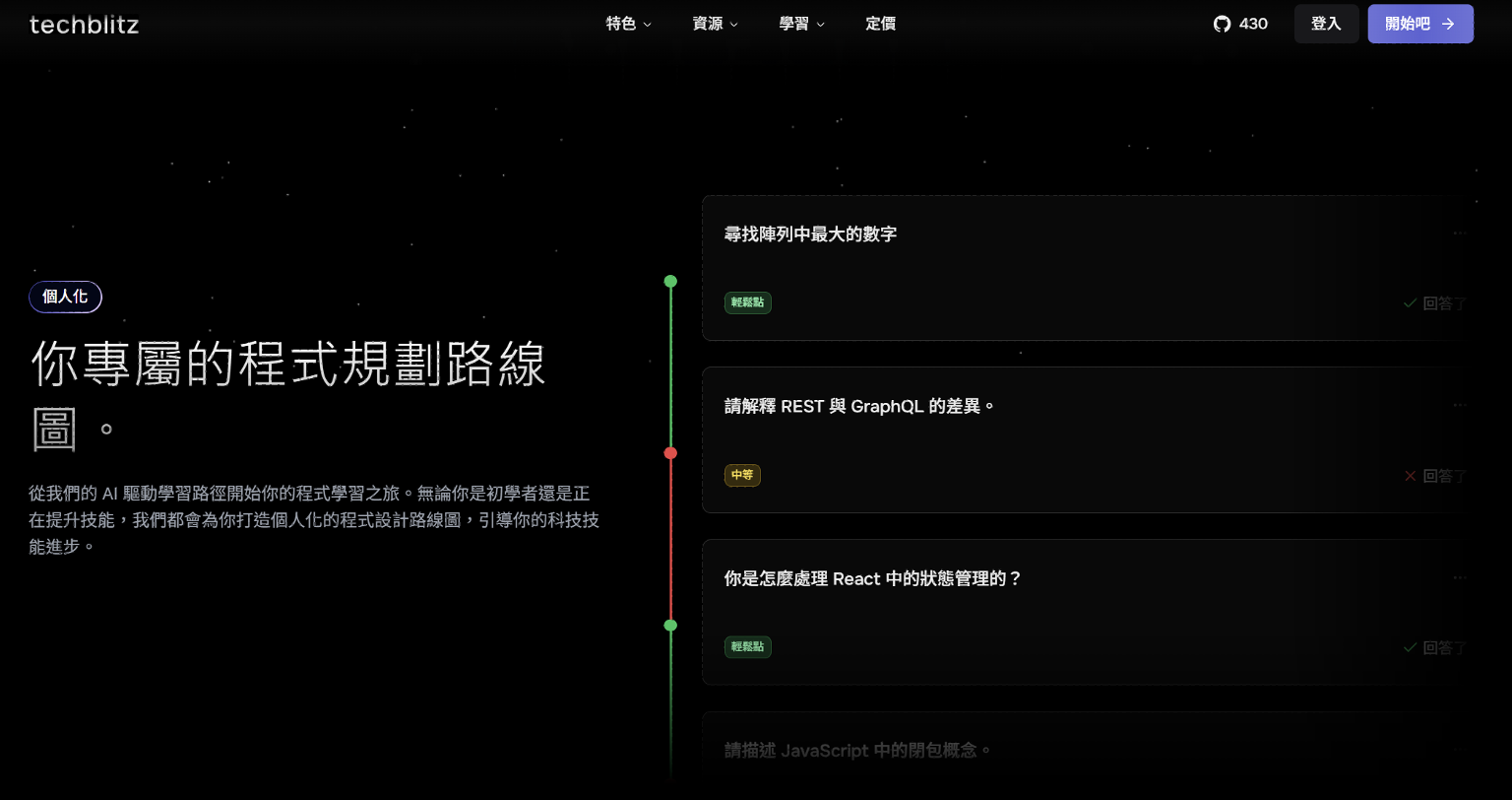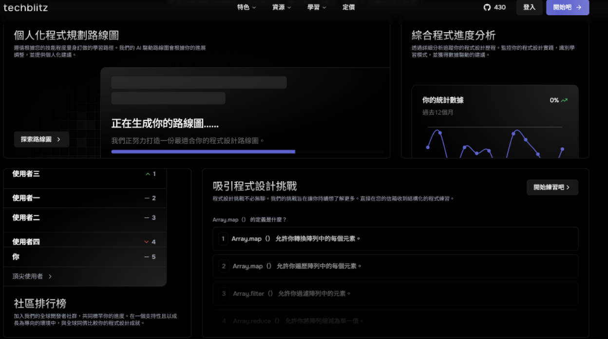個人化學習路徑:TechBlitz 會根據您的技能水準與學習目標調整,為您打造客製化路線圖,引導您的程式設計旅程。這確保你總是受到挑戰,但不會感到不知所措。